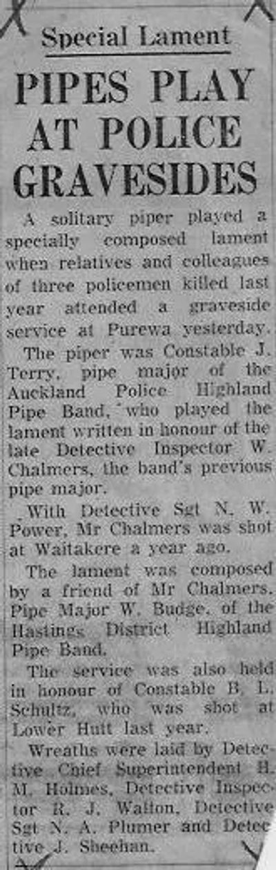 Wally Chalmers was well known in the piping world as he was a past pipe major of the Auckland Police Pipe Band. Wally had been taught by Bill who was so moved by the incident that he composed a most haunting slow air called Pipe Major Wally Chalmers.