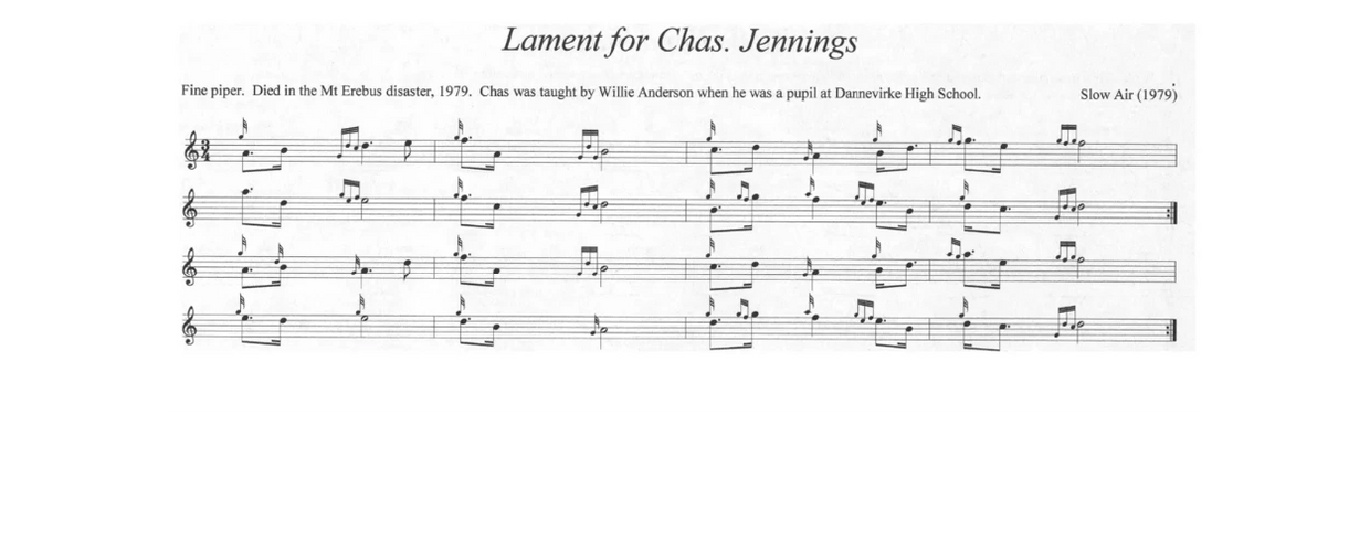 The Lament for Chas Jennings is a simple song expressing sadness at the loss of a close friend. While it is written to conform to ¾ time it should be treated like the ground of a Piobaireachd, letting your heart attune to the air and your intuitive feelings overshadow the printed note. Then, tune your pipe well and play it that way – the way that feels right to you.